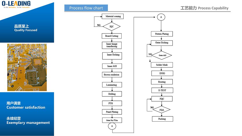 Materialschneiden → Innen-Trockenfilm → Innenätzen → Innen-AOI → Multi-Bond → Schicht-Stapel-Up-Pressung → Bohrung → PTH → Paneel-Plattierung → Außen-Trockenfilm → Muster-Plattierung → Außenätzen → Außen-AOI → Lötmaske → Komponentenmarke → Oberfläche → Routing → e / t → Sichtprüfung.